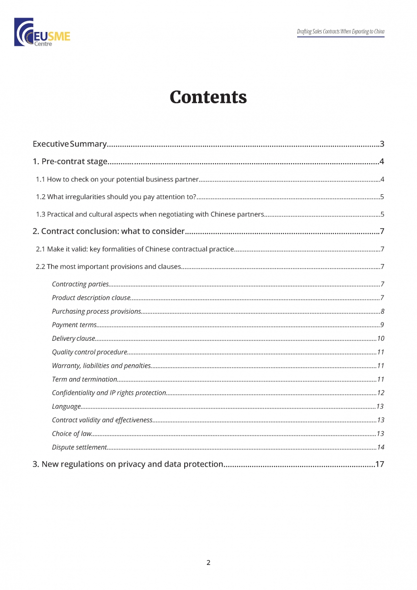 These guidelines identify the key terms, tips and examples that should be considered in a sales contract for the export of goods to a Chinese buyer. The objective is to provide European SMEs with basic, practical insight into the contractual aspect of Chinese businesses, and to help them evaluate the viability of contract arrangements with their Chinese business partners.