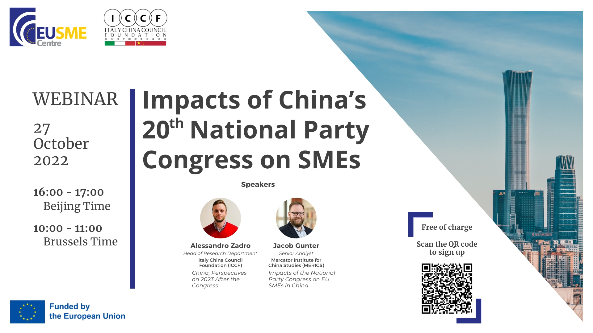 This webinar analyses the impacts of the outcomes of the China’s 20th National Party Congress to European SMEs doing business or planning to do business with China. Experts from the ICCF, the EU SME Centre, and MERICS will discuss both policy implications and economic implications of the major news resulting from the Party Congress to SMEs.