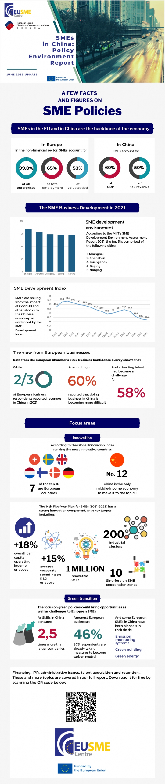 As the market evolves and regulations change, the EU SME Centre is here to provide you with the latest information and independent advice. Find out a few key data points on the business environment and focus areas for SMEs in China in our infographic about the findings detailed in the June 2022 update to SMEs in China: Policy Environment Report.