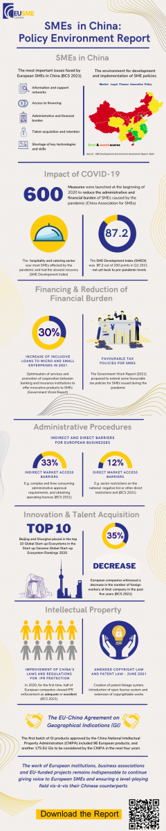 The following infographic provides a simple overview of the Policy Environment for SMEs in China based on the main findings of the report.