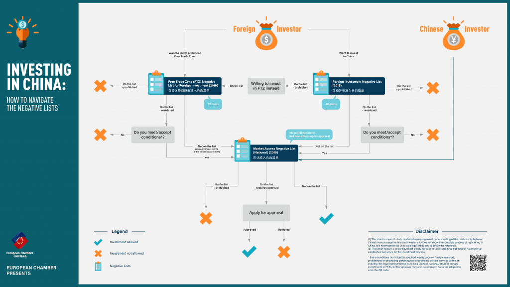 This flowchart (available to download in English and Chinese versions below), produced by the European Chamber, provides a simple introduction to the relationships between China’s various negative lists and how they dictate the conditions under which foreign and Chinese companies invest in the market.