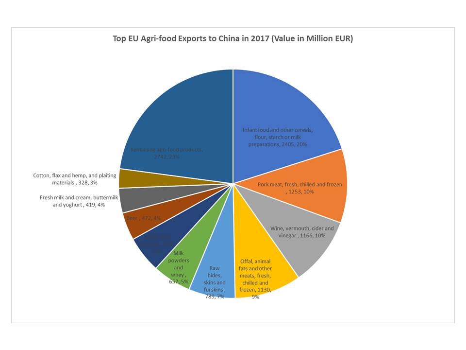 In 2017, the EU’s agri-food exports to China reached euro (EUR) 11.978 billion with a trade surplus of EUR 6.57 billion, making China the second largest destination of EU agri-food exports. Last year’s top 10 EU agri-food exports to China, by value, included the following: