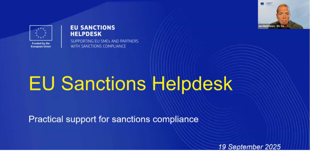 On 19 September 2025, the EU SME Centre and the European Union Chamber of Commerce in China, together with the EU Commission, the EU Delegation to China and the EU Sanctions Helpdesk co-hosted an online working group meeting to unpack the complexity of the EU’s sanctions framework, one of the most comprehensive and developed in the world. The event featured insights from Pilvi Pusa, Policy Officer at the European Commission’s Directorate-General for Financial Services and Capital Markets; Ian Matthews, Team Leader of the EU Sanctions Helpdesk; and Frederik van Essen, Senior Legal and Compliance Expert at the EU Sanctions Helpdesk.